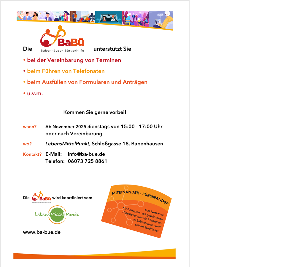 Die Sprechstunde der Babenhäuser Bürgerhilfe findet an folgenden Donnerstagen von 15:00 bis 17:00 Uhr statt: