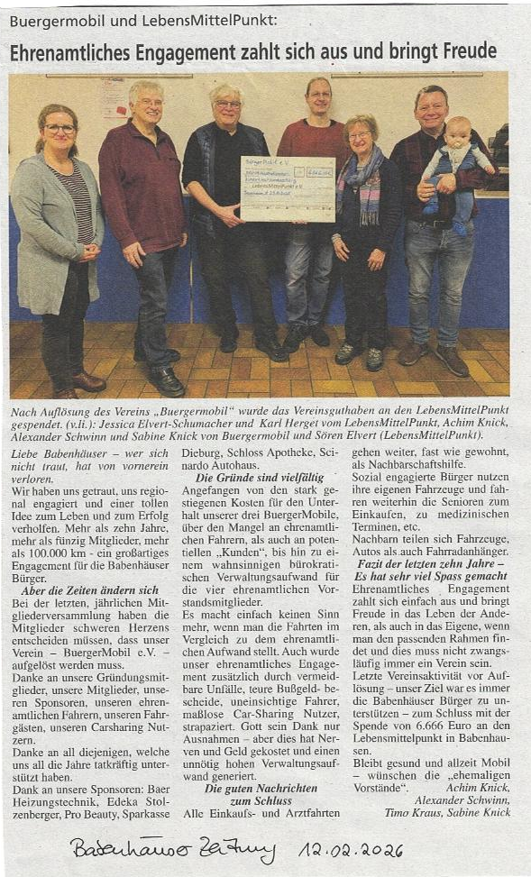 Spendenübergabe des Vereins BuergerMobil e.V. nach Auflösung - Babenhäuser Zeitung